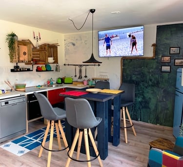 Die Wohnung ist für 4 Personen konzipiert. Egal ob kleine Familie, oder Einzelreisende. Sie bietet Spiel und Spaß, sowie eine wunderschöne, große, sonnige Terrasse. Sie besitzt 2 Schlafzimmer, ein großes Duschbad, sowie einen Vorraum mit Waschgelegenheit. Die Küche hat einen Induktionsherd mit Backofen, einen Geschirrspüler und einen großen, geräumigen Kühlschrank mit Gefrierfach, Kaffeemaschine, Toaster, sowie Wasserkocher runden die Küche ab. Kinoabende bei Regenwetter mit großen Smart TV und Wlan runden Schietwetter ab..